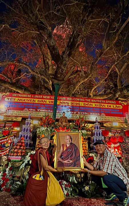 Vén. Dekyong et Urgyen Shola (directeur) du Root Institute, au siège de l'éveil sous l'arbre de la bodhi au Stoupa de Mahabodhi à Bodhgaya le 18 février 2026. Photo par Vén. Sarah Thresher.