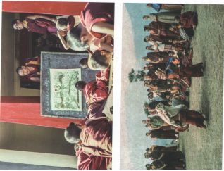 Mais la vie des boys ne se résumait pas à la discipline et aux épreuves. Ils passaient de merveilleux moments avec Lama, notamment quand ils sortaient les traditionnels masques de danse. Pour le Losar (nouvel an tibétain), les garçons passaient de merveilleux moments à se pavaner avec alentour, à jouer des cymbales et à souffler dans les longues trompes tandis que Lama Yéshé leur jetait des poignées de bonbons depuis le toit de la gompa ."